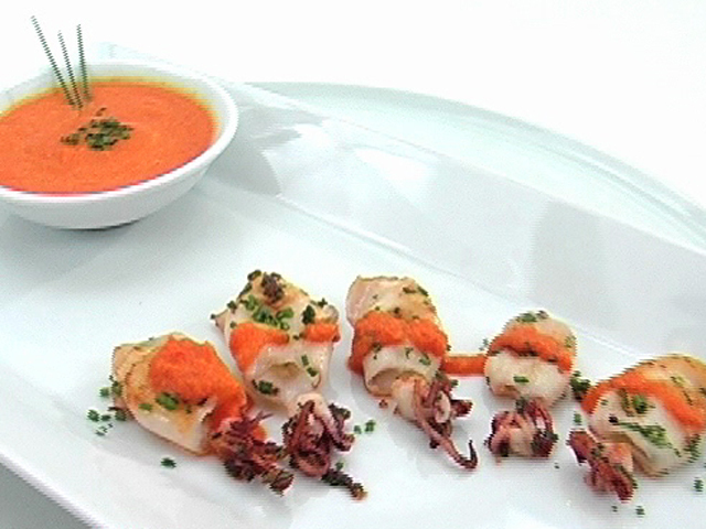 Вкусное блюдо из кальмара в необычным соусе.Состав:кальмары — 3 штуки;паприка — 1/2 столовой ложки;сухари — 1/2 столовой ложки;тмин — 1/2 столовой ложки;белый винный уксус — 1 столовая ложка;зеленый лук — 2 столовых ложки;чеснок — 3 зубчика;сладкий перец — 1 штука;оливковое масло, соль — по вкусу.