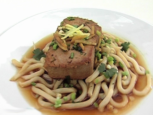Легкий суп из тунца с лапшой.Состав:тунец — 1 кусок;бульон «Даши» — 100 гр;имбирь — 20 гр;бальзамический уксус — 1 столовая ложка;оливковое масло — 1 столовая ложка;соевый соус — 1 столовая ложка;сок одного лайма;чеснок — 3 стебля;кориандр — 2 столовых ложки;лапша — 100 гр;немного соуса «Табаско».